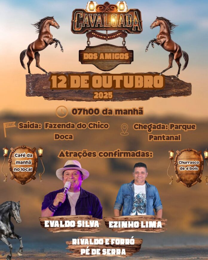 A tradicional Cavalgada dos Amigos já tem data marcada! O evento acontecerá amanhã  12 de outubro de 2025, com saída às 7h da manhã da Fazenda do Chico Doca e chegada no Parque Pantanal, em Pimenteiras (PI).