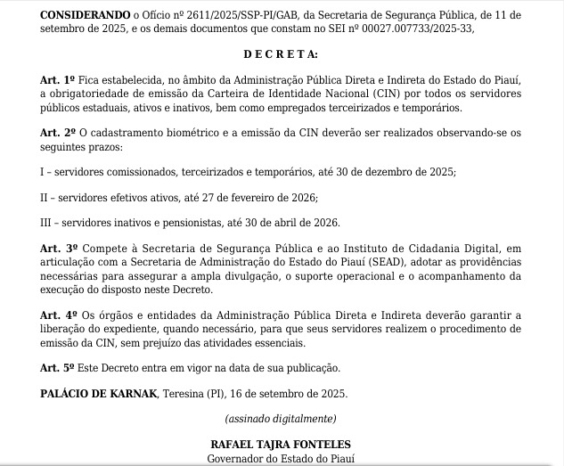 O Governo do Estado do Piauí publicou no Diário Oficial o Decreto nº 24.080, de 16 de setembro de 2025, que estabelece a obrigatoriedade de emissão da Carteira de Identidade Nacional (CIN) para todos os servidores públicos estaduais, incluindo ativos, inativos, terceirizados e temporários.