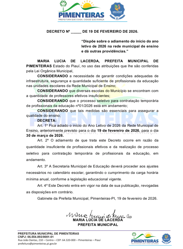 A Prefeitura Municipal de Pimenteiras, no estado do Piauí, anunciou oficialmente o adiamento do início do ano letivo de 2026 na rede municipal de ensino. O decreto, publicado em 19 de fevereiro e assinado pela prefeita Maria Lúcia de Lacerda, estabelece que as aulas, antes previstas para começar nesta mesma data, terão início apenas em 30 de março de 2026.